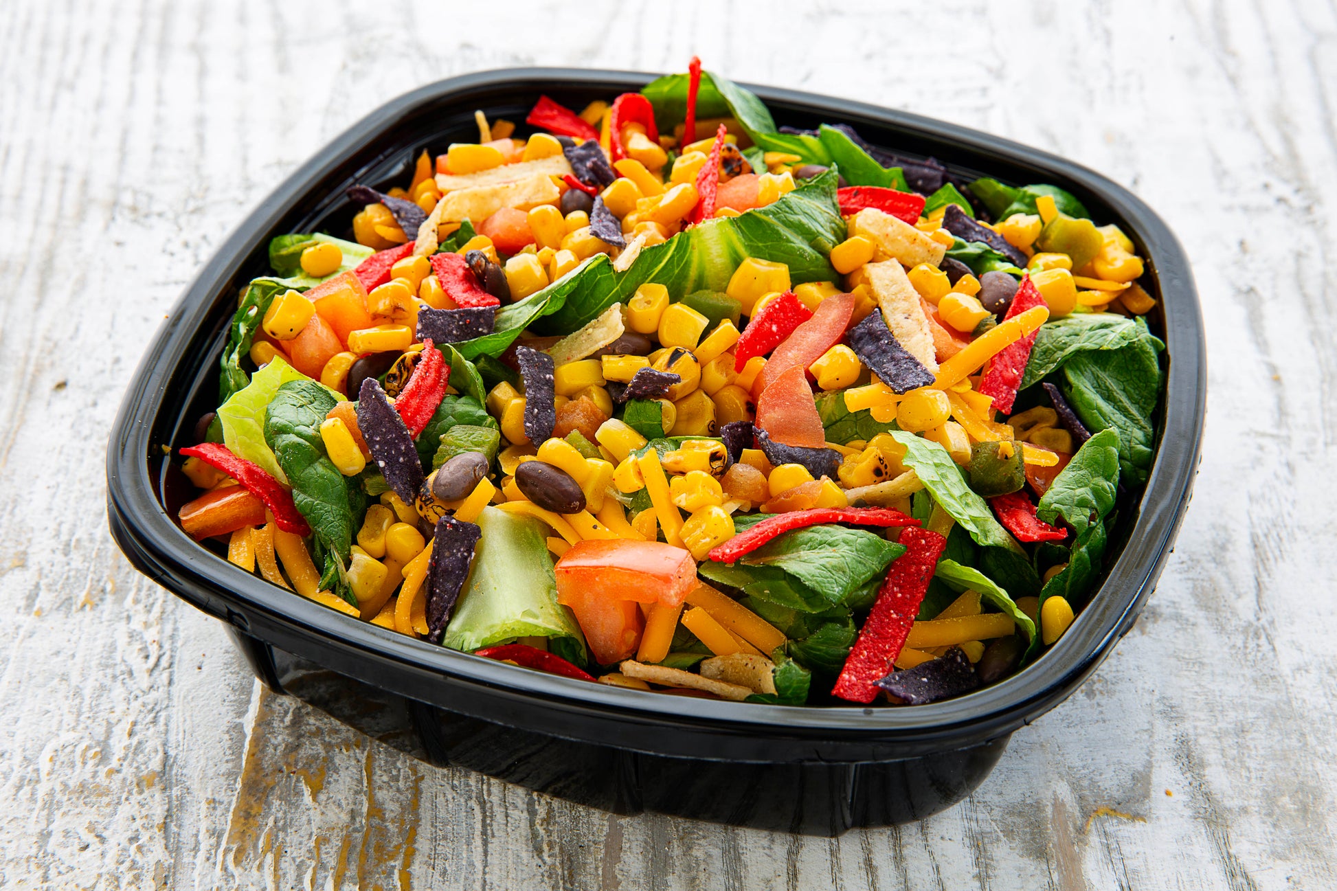 Shredded Sharp Cheddar Cheese, Roasted Corn & Black Bean Mix, Tomato & Tortilla Chips. Served on Romain Lettuce.
