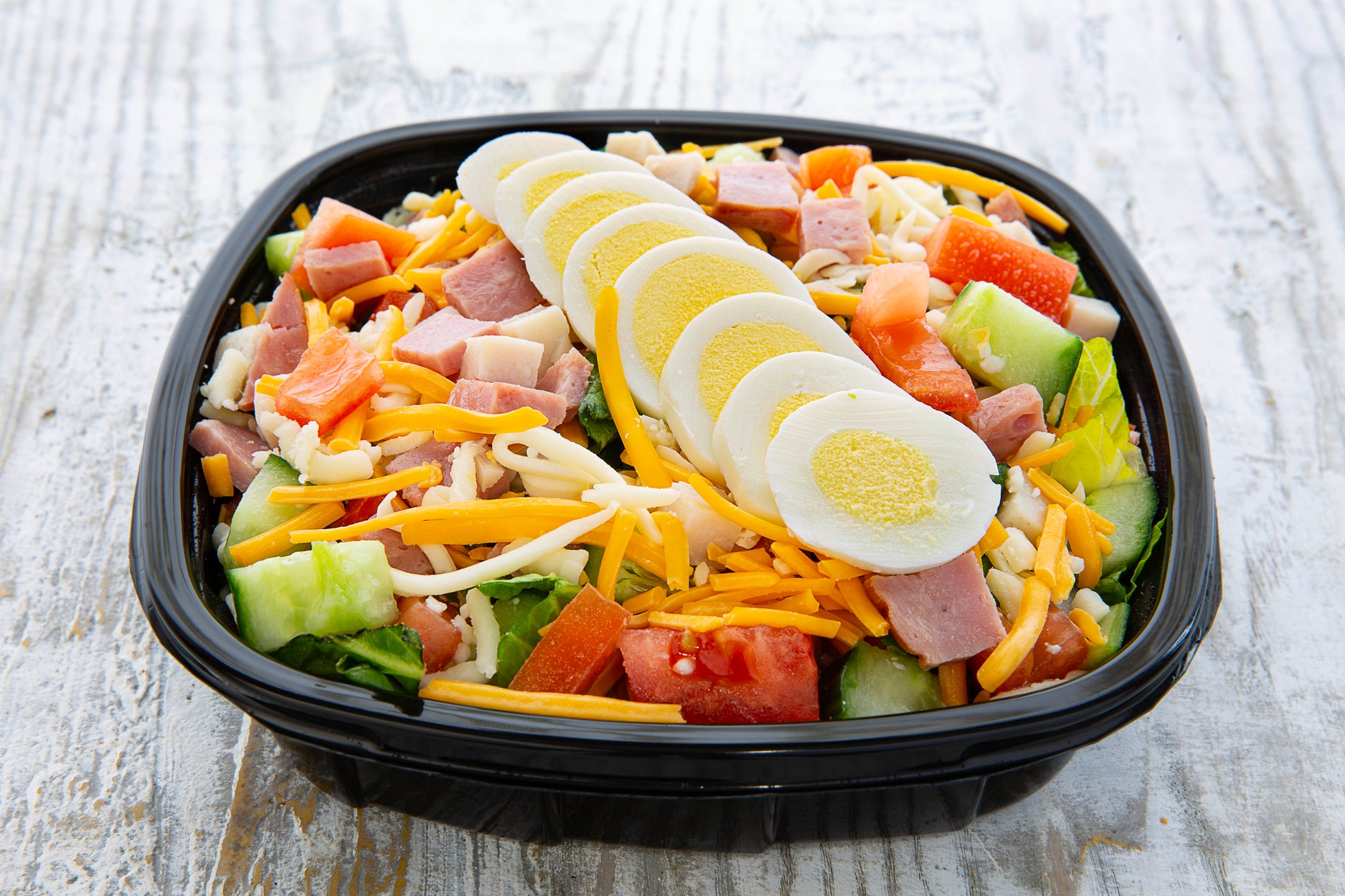 Diced Turkey, Diced Turkey Ham, Tomato, Red Onion, Cucumber, Shredded Swiss, Shredded Cheddar Cheese & Boiled Egg, Served on Romaine Lettuce.